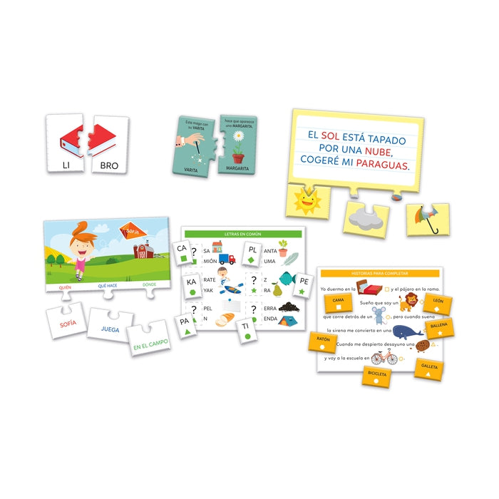 Usando las fichas y las tarjetas con las sílabas, podrán contar historias a la vez que aprenden a leer en un proceso sencillo y muy entretenido.