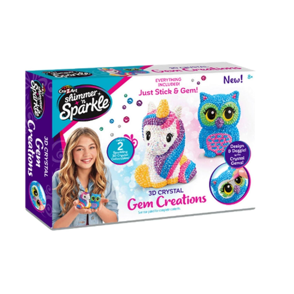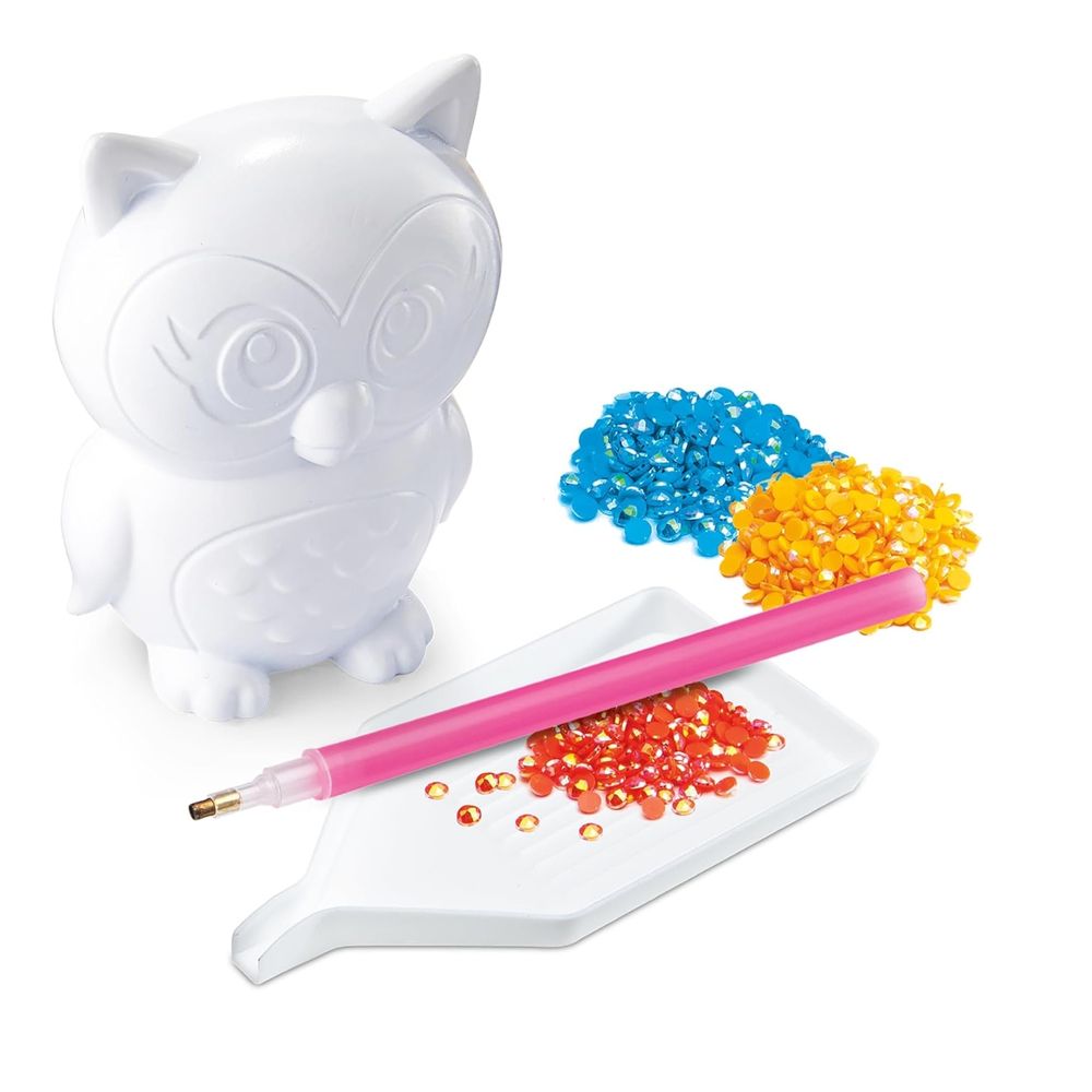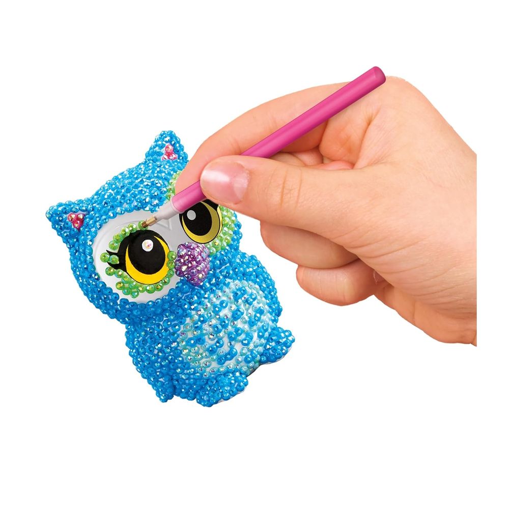 Crea tus propias creaciones brillantes con gemas de cristal 3D. Crea personajes bidimensionales. ¡Incluye todo, solo pega y gemea! ¡Diseña y deslumbra con adorables coleccionables! Aplica gemas de colores a un búho y un unicornio.