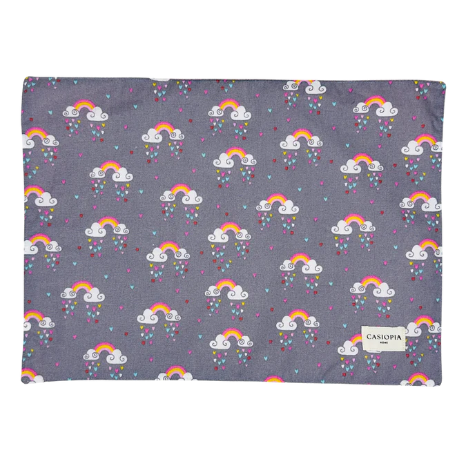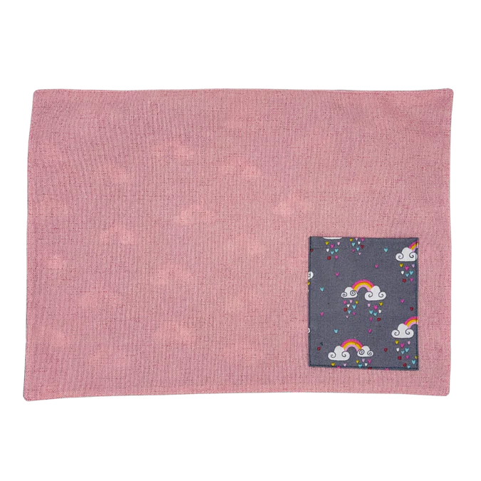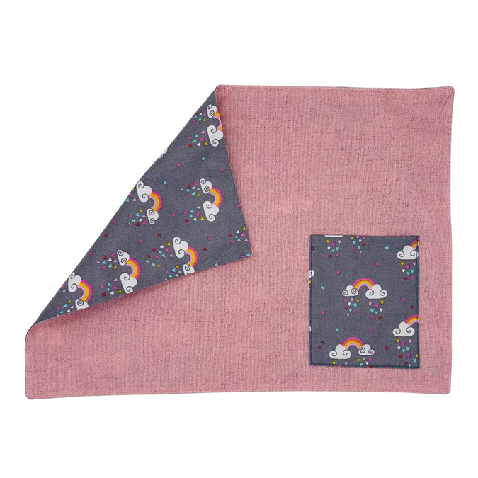 Preciosos y prácticos individuales de lonchera reversibles con nuestra tela antimanchas color rosa por un lado, y por el otro un divertido estampado de arcoiris sobre fondo gris, ideal para los más peques de la casa. El lado color entero lleva incorporado un pequeño bolsillo en el estampado de los arcoiris, perfecto para meter los cubiertos o la servilleta.