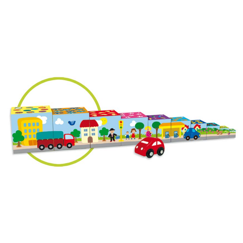 Apila los diferentes cubos siguiendo sus secuencias. Contiene 5 ilustraciones diferentes muy vistosas y de vivos colores. Incluimos un coche de madera que aparece en una de las ilustraciones.
