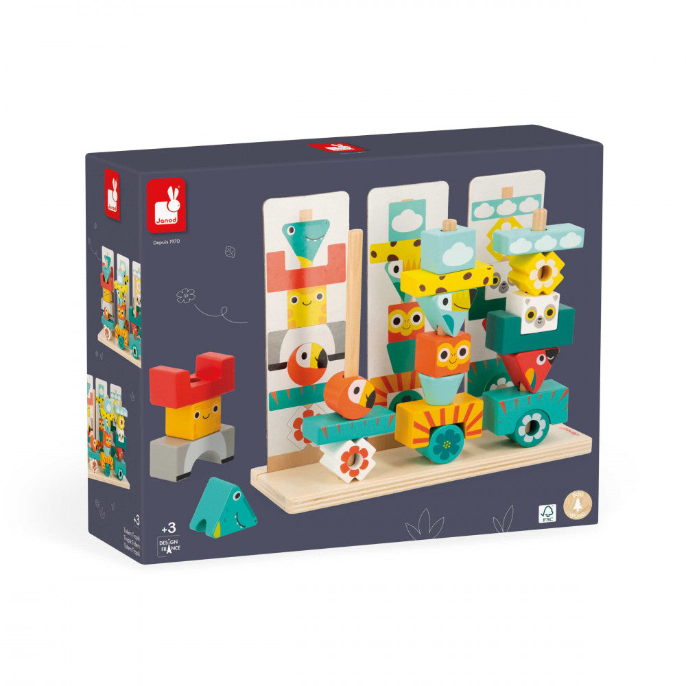 ¡Venid a conocer los distintos tótems de la selva tropical! Con 52 piezas de madera y 6 tarjetas impresas por ambos lados, el niño podrá reproducir los 12 modelos propuestos o dar rienda suelta a su imaginación creando sus propios y originales tótems. En las coloridas piezas el niño descubrirá, bien escondidos, a los animales de la selva, como el mono, el loro o el cocodrilo. Juguete educativo ideal para estimular la capacidad de observación y ejercitar la destreza. Juguete de madera y cartón FSCTM para niños a partir de 3 años.