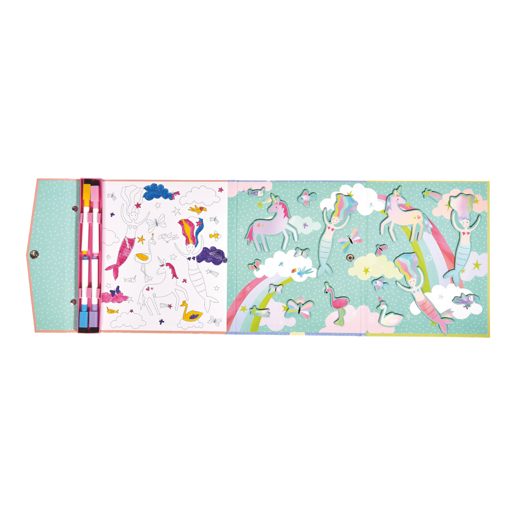 Cada uno se abre para revelar un rompecabezas de 20 piezas, 4 marcadores de borrado en seco de colores con borradores, piezas de juego desplegables, una sección para dibujar y colorear y todo es magnético, por lo que no hay posibilidad de perder ninguna pieza mientras estás fuera de casa.