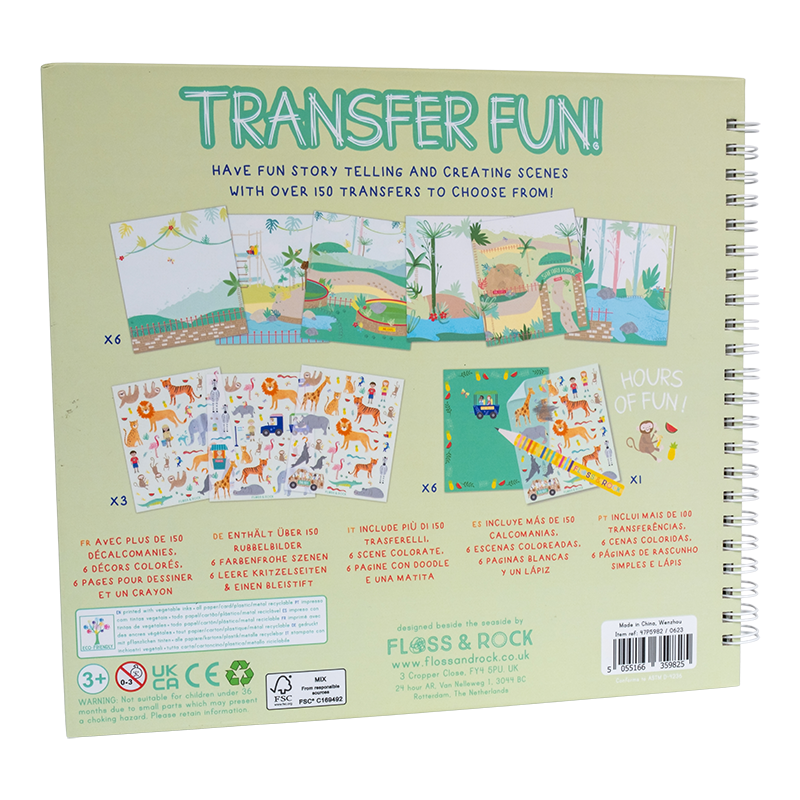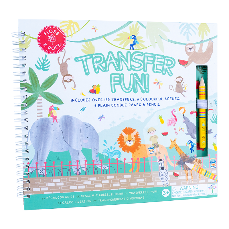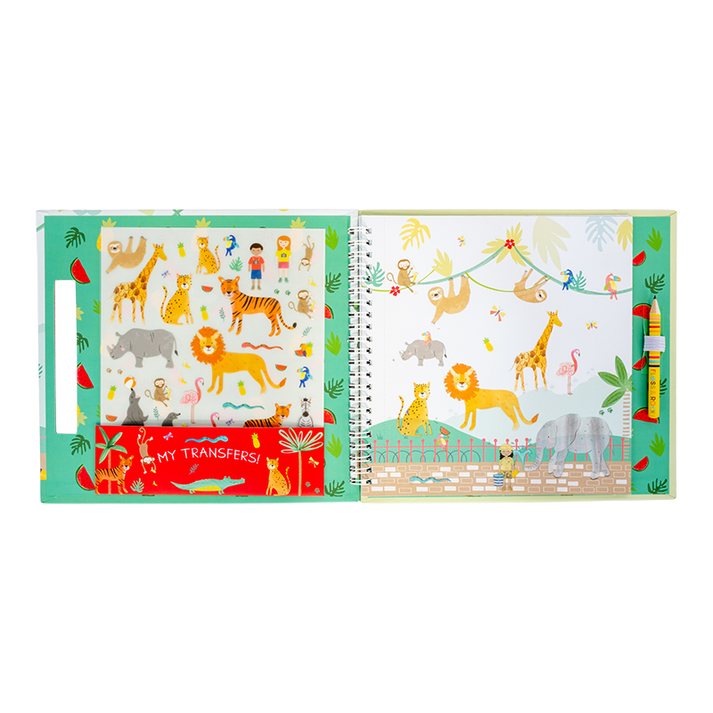 ¡Diviértete muchísimo con las Transferencias! Este Jungle Transfer Fun incluye más de 150 brillantes transferencias con temática de jungla, 6 escenas coloridas para colocarlas, 6 páginas lisas para dibujar a tu gusto y un lápiz. Abre el libro de espiral para encontrar todas tus transferencias ordenadas en el bolsillo "Mis Transferencias", busca la ilustración que hayas elegido y hojea las páginas para encontrar la escena perfecta. Rasca la parte superior del dibujo con el lápiz Floss & Rock incluido y levanta la hoja; como por arte de magia, las encontrarás transferidas. Pasa horas felices despertando tu creatividad y creando hermosos dibujos con leones, tigres, jirafas, perezosos y mucho más.
