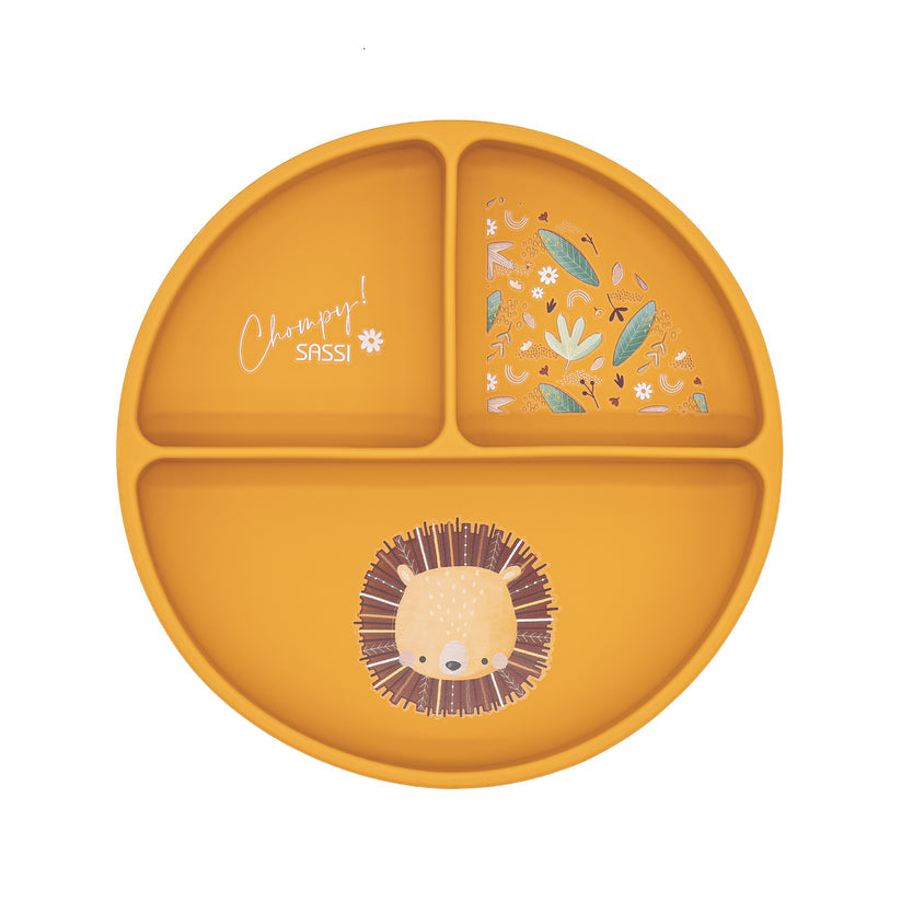 Plato de destete de silicona con base de ventosa, decorado con el valiente león Chompy.