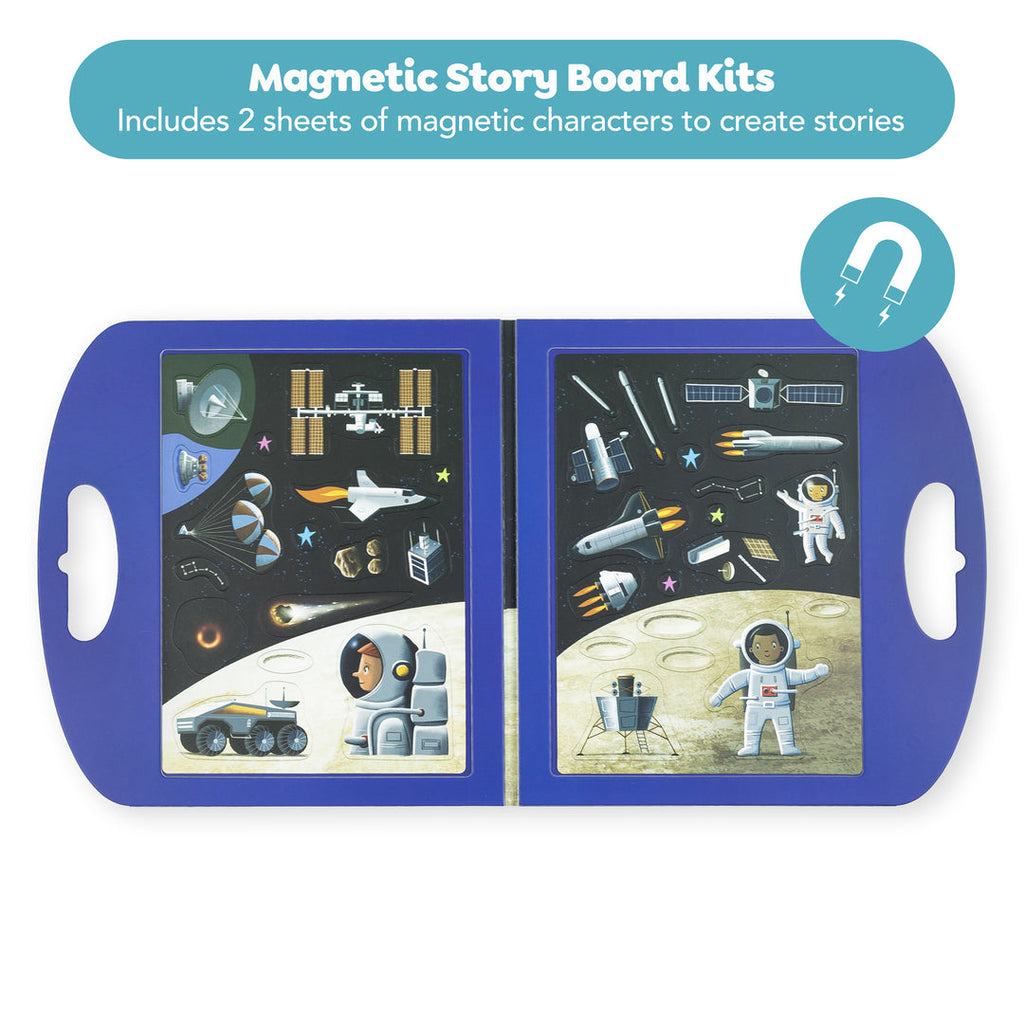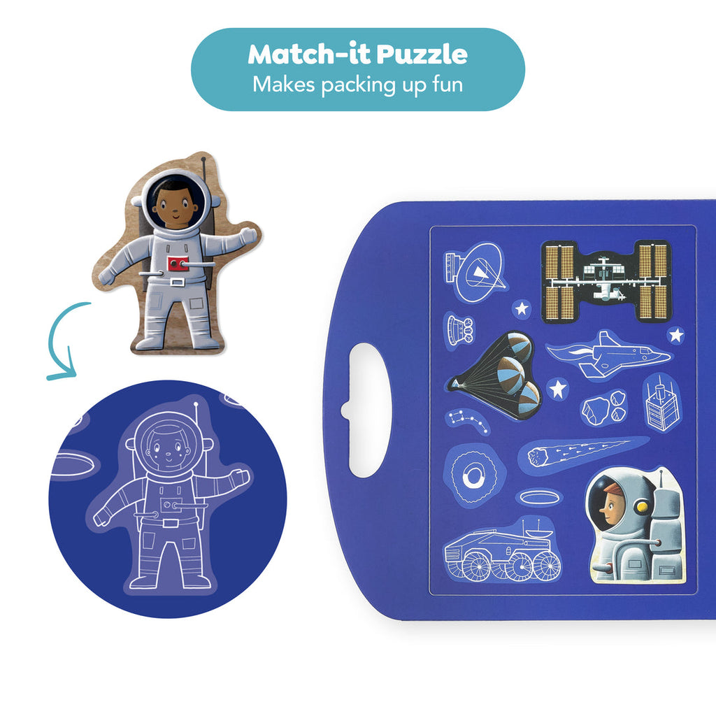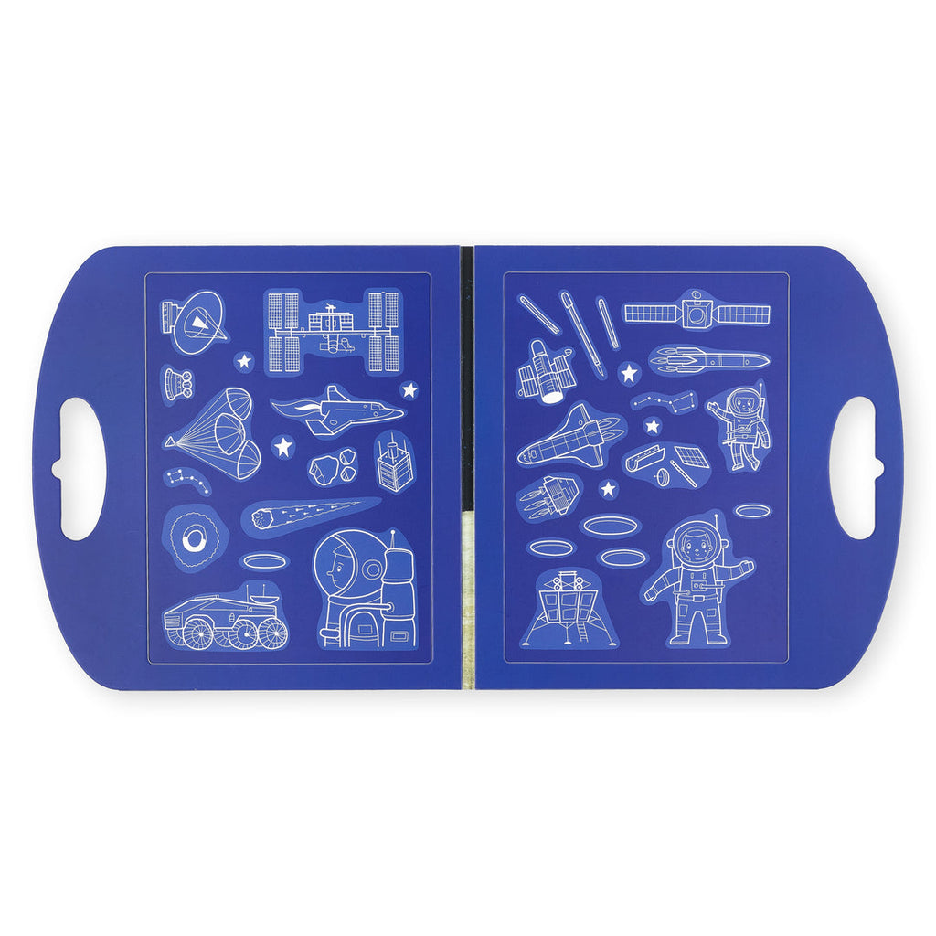 Lleva a tu pequeño astronauta al sistema solar con una escena de juego magnética, plegable y fantásticamente ilustrada. Vuela cohetes y transbordadores de todas las formas y tamaños, planta tu bandera en la Luna o disfruta de una caminata espacial en gravedad cero.